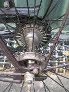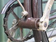 You can see that the bike has been used a lot. Both (same sized) rear chainwheels are completely worn, so a third chainwheel was added. This is the way people kept those bikes running! Nevertheless: I think a blockchain or double roller-chain would look better on this bike.